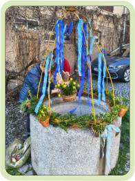 Frühlingsblumen geschmückt. Die Kinder der Altbacher