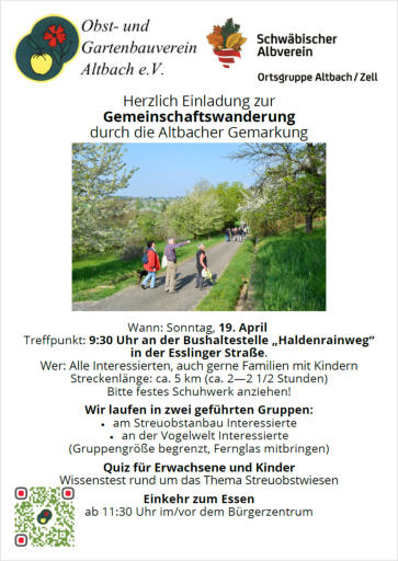 Sonntag, 19. April, 9:30 Uhr Gemeinschaftswanderung durch die Streuobstwiesen mit dem Schwäbischen Albverein OG Altbach und anschließendem Essen im Bürgerzentrum (ab 11:30 Uhr) Treffpunkt: Bushaltestelle „Haldenrainweg“ in der Esslinger Straße Mittwoch, 22. April, 19:00 Uhr Achtung Terminänderung! Stammtisch mit Film einer unserer Lehrfahrten Ort: Meilke‘s Kochtöpfle im Schießhaus Samstag, 27. Juni Tageslehrfahrt Ziel: Hohenlohekreis Alle Termine